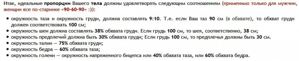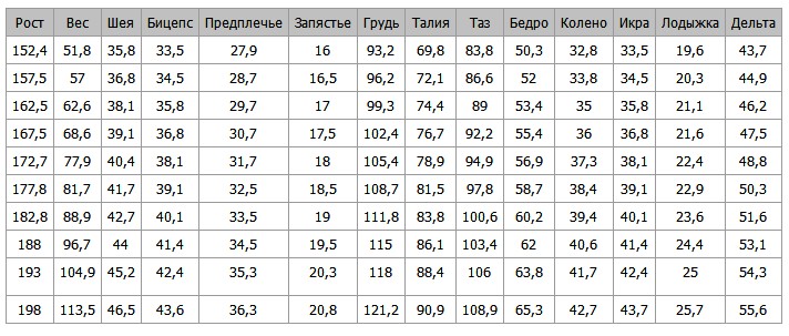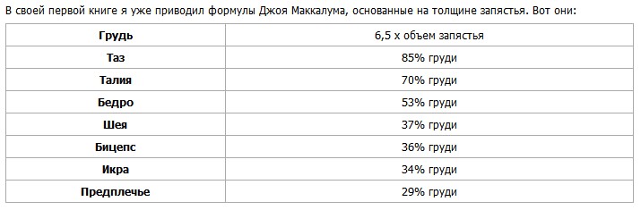 OlegRO Опубликовано 7 сентября, 2016 Опубликовано 7 сентября, 2016 вот замеры из Думай2 МакРоберта перед вами формула, ориентированная на здоровых мужчин в возрасте от 18 до 35 лет. Любой мужчина этого возраста с нормальным здоровьем, даже новичок в накачке, может рассчитывать на полное перевоплощение (по формуле) по истечении нескольких лет тренировок по моей методике. Те, кому от 35 до 45 и кто уже давно тренируется с отягощениями, в принципе могут добиться тех же результатов, что и атлеты до 35 лет. Если же вам от 35 до 45 и вы прежде никогда не тренировались, то здесь надо несколько умерите ожидания, во всяком случае, в первые годы тренинга. Ну а потом, при условии высокой мотивации, вы сможете выйти на те же показатели, что и культуристы с опытом. Если вам за 45, вы также способны преобразить свою мускулатуру, хотя и не столь радикально, как те, кто вас моложе. Впрочем, “радикально” - понятие условное. В сравнении со сверстниками вы будете выглядеть Геркулесом. К тому же не забывайте, что мышцы на 50-летнем мужчине смотрятся более эффектно, чем на молодом. Мы привыкли к юным атлетам, а вот силовой имидж в 50 лет всем в диковинку. Впрочем, опыт показывает, что главный ограничитель в бодибилдинге - совсем не возраст, как думают многие, а психологический настрой. С годами обычно падает заинтересованность в результате, только и всего. Ну а вообще-то в мире бодибилдинга сегодня можно встретить 60-летних атлетов, которые не ленятся тренироваться в силовом режиме и выглядят ну точно как в 25-30 лет. Запястье надо измерять чуть выше косточки, выступающей на нем со стороны мизинца (шиловидного отростка локтевой кости), то есть ближе к локтю - так советует сам Маккалум. Из любого правила есть исключения. В идеале между толщиной запястья и длиной, толщиной всех прочих костей действительно есть статистическая закономерность. Однако есть люди, у которых скелет состоит из двух неравномерных половин - верхней и нижней. Кости верха тонкие, а низа, наоборот, - очень толстые. Есть и особенности мышечной системы. К примеру, группы мышц по-разному реагируют на нагрузки. Из-за всего этого, понятно, в личных показателях возникают перекосы. Согласно формуле Маккалума, “классическое” запястье “слабо отзывчивого” в 17,5 см предполагает окружность груди 114 см, таза - 97 см, талии - 80 см, бедра - 60 см, шеи - 42 см, бицепса в напряженном состоянии - 41 см, икр - 39 см и предплечья - 33 см. При росте 175 см такое развитие соответствует весу примерно в 85-86 кг. По любым меркам такая мускулатура - нечто из ряда вон выходящее. Еще раз хочу подчеркнуть, что речь идет об ориентирах тренинга, а не о каких-то ваших пределах. Нет, многие из вас обязательно смогут превысить эти показатели, но прежде чем думать о большем, нужно, по крайней мере, приблизиться к ним. Первым делом рассчитайте свои будущие параметры по формуле Маккалума и сосредоточьтесь на их достижении. Когда добьетесь своего, можно будет двинуться дальше, к новым целям. Чтобы их определить, к каждому показателю по формуле Маккалума прибавьте еще по 5%. Когда освоите эти горизонты, прибавьте еще по 5%. Таким образом, на всем своем пути вы будете иметь перед глазами реальные, а значит, достижимые цели. Ну а “запасть” на 150-килограммовых профессиональных монстров для любителя попросту означает похоронить себя заживо. Еще о костях В конце 70-х годов врачом Дэвидом