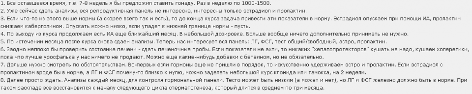 wolf Опубліковано: 11 вересня 2015 Опубліковано: 11 вересня 2015 вопрос по прежнему не дает мне спокоя, кто как выходит с курсов подобных? Анализы сдай на пролактин и эстрадиол Уничтожаешь эстрадиол и пролактин, поближе к 0.юзай иа и ип В последнюю неделю курса нужно было гонады проставить уколов 5-6
