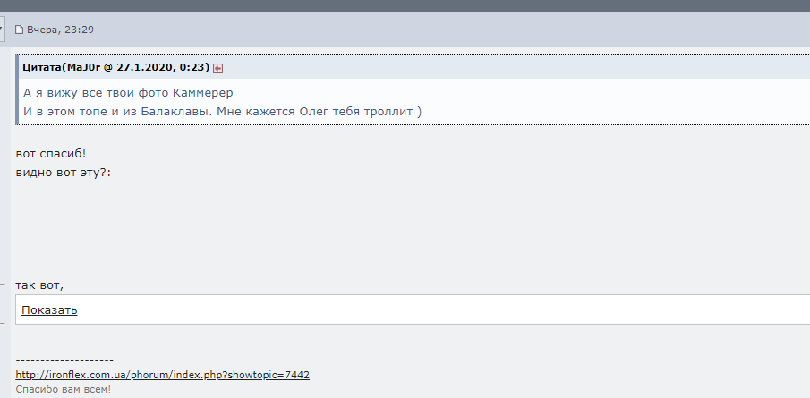 MaJ0r Опубліковано: 26 січня 2020 Опубліковано: 26 січня 2020 А я вижу все твои фото Каммерер И в этом топе и из Балаклавы. Мне кажется Олег тебя троллит )
