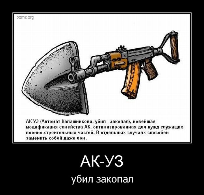 shura Опубликовано 13 июля, 2011 Опубликовано 13 июля, 2011 я помню про стройбат: - Американский инструктор в учебном центре морской пехоты объясняет новобранцам: — Есть у русских такой воздушный десант. Один их воздушный десантник с вами тремя справится. Но это не все. Есть у русских морской десант. Эти и вовсе отморозки. Один их морской десантник вас пятерых уделает, как младенцев. Но и это еще не самое опасное. Есть у них страшные войска. Стройбатом называются. Такие звери, что им даже оружие выдавать боятся. Шура, отдельное спасибо. Я конечно не понял что там не работает, кому втык дать? Разберемся как положено и накажем кого попало. Главное не забыть наградить непричасных) Рунет- русский сегмент интернета, у тебя видать он то ли не быстрый , то ли блокируется частично.