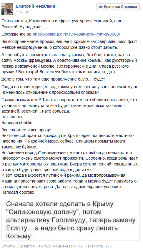 templar Опубликовано 27 ноября, 2015 Опубликовано 27 ноября, 2015 Думаю что если б Крым снова стал украинским народ поехал бы аж бегом. Я б точно поехал. И вода б там появилась, и свет и газ и турист и цены б упали на продукты и свои овощи и фрукты б в избытке появились. я бы тоже поехал. раньше ездил каждый год. этот год был первым когда не поехал. теперь пока русня с крыма не съебется ноги моей там не будет, пусть хоть доплачивают за посещения)