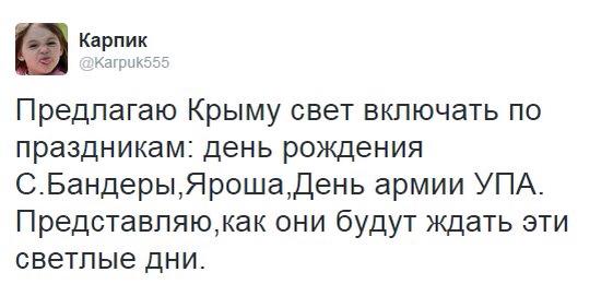 bobir2005 Опубликовано 2 декабря, 2015 Опубликовано 2 декабря, 2015 Татьяна Заровная 9 hrs · Kyiv, Ukraine · Edited · Мой друг мониторит севастопольские форумы: "Первая ласточка из севастопольского форума, и модератор не затер: "противно было вчера смотреть передачу соловьева, где пытаются рассказать, как у нас все тут зашибись!".(до этого несколько дней были высказывания типа "а нам все по хую, пусть они подавятся, мы русские", затем начались обсуждения генераторов и светодиодных лампочек". А то, как эту ситуацию комментит официальная пропаганда и граждане-сторонники путлер-капута, говорит о том, что империя уверенно движется к развалу. Это же отчетливо показала реакция на сбитый турками самолет - народ стремится к изоляции, яростно строит железный занавес. Аналогия с СССР, который боролся за мировое господство, а потом мирно развалился в Беловежской пуще. Куда смотрят МЧС, которые отправили по районам вычислять где не отключают свет? Почему на Семашко, Грессе, Маршала Жукова, Лексина не отключали свет ни разу за эти 10 дней????? Почему я, живя на улице Залесская, с первого дня живу во тьме, получаю по 2 часа в день свет, а там люди даже не парятся? Вчера свет дали с 5 утра до 8, потом включили в 22-00, 14 часов не было света, а у некоторых его и сутками нет!!!! Куда обратиться с этим вопросом? Я не понимаю, что за не справедливость??? Может хоть здесь меня услышат! А на вечерних совещаниях говорят о том, что ситуация улучшается! Где она улучшается???? Электроэнергию с каждым днем дают все меньше и меньше!!!!! Её услышали и : Мэр Симферополя предложил горожанам сообщать о домах, где не отключают свет