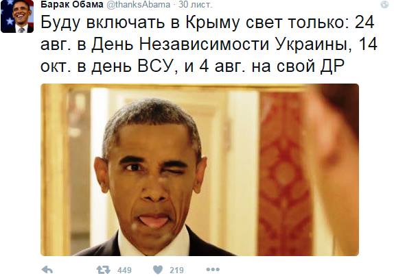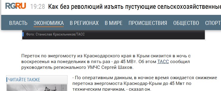 Дагот Опубликовано 6 декабря, 2015 Опубликовано 6 декабря, 2015 Новости Крымнаша. Выпуск #389 за 06.12.2015 «Удар в спину?» 1. Порошенко: поставки электроэнергии в Крым будут восстановлены в ближайшее время по линии “Каховская-Титан” http://www.rbc.ua/rus/news/poroshenko-post...1449428365.html . Восстановление энергоснабжения может быть прекращено в конце декабря в случае невыполнения ряда условий http://ukranews.com/news/191810.Aktivisti-...vskaya—Titan.ru . Крым может рассчитывать на поставку не больше 250 МВт. При этом, Чубаров не исключает, что электрику оккупанты перекинут на военные гарнизоны. Я чего-то не понимаю? http://24tv.ua/ru/ukrainskoe_jelekt...ekin...hubarov_n637585 . Зато в россии сообщают, что переток по энергомосту в Крым снизится ночью почти в пять раз по техническим причинам до 45 МВт http://ru.krymr.com/content/news/27410216.html 2. Если поставки электроэнергии в Крым — не фейк, то НАХРЕНА надо было всё начинать? Помочь рашке сбыть залежалые запасы генераторов? 3. Ну, и зачем вы опоры подключаете? Весело же было! 4. Бабки у подъезда напьются в усмерть под вопли: “Мы говорили — володя не допустит, володя всё порешает…” 5. У меня в Саках почти целый день свет есть, и я думаю — это так называемый энергомост или Украина?!! 6. Крымчане воспримут это не как жест доброй воли, а слабость Украины, мол, “хохлы” поняли, что не удалось! И эта непоследовательность играет в минус и еще больше отталкивает крымчан, которые презирают слабость. Сейчас скажут, что путин реально всех переиграл — он основной бенефициарий этого включения. 7. Самый худший момент дать свет Крыму! Здесь все будут убеждены, что свет появился не “хохлятский”, а именно путинский, краснодарский! 8. Вата только излечиваться начала, так им опять зомбоящик воткнут?! Что за дела-то?!! 9. Еще детей Генераторов не успели нарожать, а вы, вот это вот, со своей электрофилией доиграетесь. 10. Симферополь. Я счёт уже не веду, сколько суток есть свет. Свет есть, два дня есть даже горячая вода и батареи топят. А читаю в интернете, у кого-то полная жопа. (прим. С понедельника в Симферополе на линии выйдут 40 троллейбусов http://news.allcrimea.net/news/2015...ropo...leibusov-50209/ ). 11. Гурзуф. Свет есть целый день — это просто праздник какой-то. День ВСУ, например! (прим. Позже было сообщение, что свет отключали на 4 часа). 12. Я сегодня почти целый день в интернете, потому что есть свет, и это зрада! Но веерные отключения продолжаются, местами дали тепло в дома. Если Украина даст свет под любыми договорённостями, то вата будет думать, что это путин крутой. Вате не расскажут, что это Украина. 13. Кача-Орловка. Сегодня не отключали свет((( 14. Феодосия. Вчера свет отключали два раза днём на час, вечером на четыре с 20 до 24-00. В другом районе света не было 8 часов днём. В общем, свет отключают. “Мэр” Феодосии сказал, что с понедельника город будут отключать, как и всех в Крыму. 15. Евпатория. В супермаркете Фреш: “Что, больше не будут отключать?” Кассирша: “Света нет, это генераторы завезли и от них работаем”. Вот и весь мост! 16. С понедельника электричество в Ленино будет 12 часов в сутки, пятью порциями, согласно графика РЭСаhttps: //twitter.com/fffg56346034/status/673484653899218944 17. Не надо только про договорняки с Украиной по электричеству. С завтрашнего дня в Севастополе новый график 2 через 6. Все хорошо! (прим. Сообщение написано до появления новости в пункте 1). 18. Популярные экскурсии в нынешней Ялте: 1. Выставка генераторов в светлое время суток. 2. Экстремальные перемещения по н