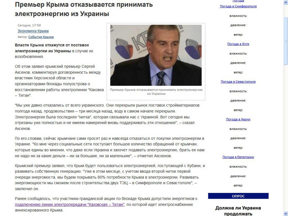 Арис Опубликовано 7 декабря, 2015 Автор Опубликовано 7 декабря, 2015 Новини ПрофільГражданская Блокада Крыма Громадська організація · 2 013 уподобань· 1 год · .. Сегодня вечером, Штаб Гражданской Блокады Крыма даст официальное заявление по сложившейся ситуации одного из этапов энерго блокады Крыма, а именно подключения одой из линий, Каховка-Титан. Все под контролем активистов, Автономная Республика Крым получит не более 200 - 250 Мвт. 9 вподобань · 25 коментарів · 6 поширеньПодобається Коментувати Поширити https://www.facebook.com/Гражданская-Блокад...378005/?fref=nf