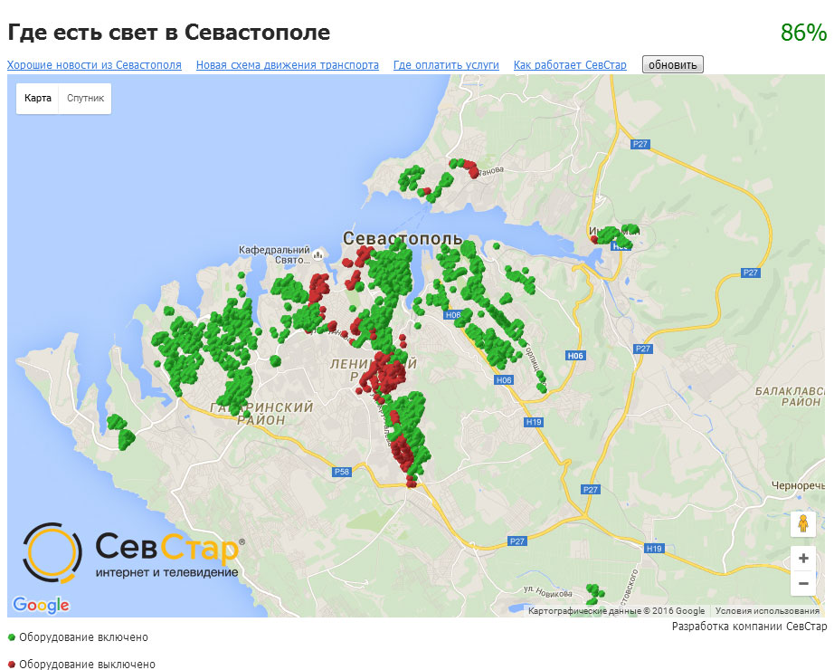 Pick_assO Опубликовано 4 января, 2016 Опубликовано 4 января, 2016 Судя по сервису одного из севастопольских провайдеров, которым они хвалились, когда из Украины снова начали подавать электричество и все горело зеленым, теперь часть домов без электричества: