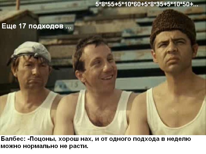 Skodnik Опубликовано 31 мая, 2013 Опубликовано 31 мая, 2013 в свете всего этого вопрос, а почему именно так посчитан вес? 16 кг на одну руку, на две это 32кг, вторая рука что не работает? ))) Тю)! точно))) протупил Я еще себе думаю, ну ваще трындец... позорно так)))) Жим гантелей сидя 4х8 16-24-24-20= 670 кг*2=1340 2.Тяга штанги к подбородку 4х10 15-25-35-35 = 1770 3.Разведение гантелей в стороны 4х10 6-6-6-6 = 240*2=480 4.Разведение гантелей стоя в наклоне 4х10 6-6-6-6 =240*2=480 5.Жим гантелей наклонный 4х8 16-24-24-20 = 670*2=1340 6.Грудное сведение гантелей сидя под наклоном 4х10 10-12-12-12 = 460*2=920 7.Жим лежа широким хватом 4х8 40-40-40-40 = 1280 V =7,6 т n 256 t 60 минут I= 29,7 Хотя не особо меня спасло)