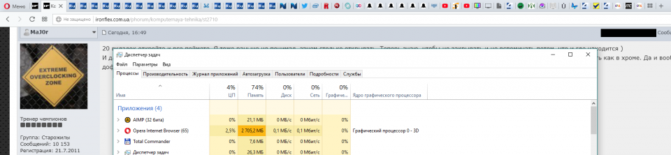 Outlawif Опубліковано: 22 грудня 2018 Опубліковано: 22 грудня 2018 Кирилл, а сколько у тебя закладок одновременно открыто? Не посчитал, закрыл уже. Но там циферка в скобочках (118) - это потоки. С одной вкладкой 13 потоков, потом по одному на вкладку открывает (иногда открывает "лишние", но на короткое время). Так что около сотни наверное было. мониторы 50+ дюймов? 2 по 27. Открытые вкладки копятся как снежный ком. Просто лень их закрывать. Когда становится совсем овердокуя, я просто оставляю одну, остальные закрываю.