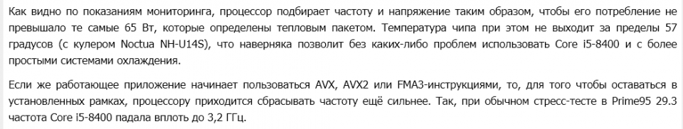 AT0N Опубліковано: 14 січня 2020 Опубліковано: 14 січня 2020 ЦП не будет выходить за пределы своего пакета мощности Ще раз - ТДП не є прямим еквівалентом споживної електричної потужності процесора. Це усереднений показник теплової енергії, яка виділяється у процесі роботи проца, вона може гуляти від 20Вт (умовно) в моменті бездії до 100Вт (умовно) під нагрузкою. Виробник проца після своїх якихось тестів підрахував, що відводити від проца 65Вт теплової енергії буде достатньо для його довготривалої безпроблемної роботи. А електричну енергію проц може (і буде) брати більше 65Вт під нагрузкою.