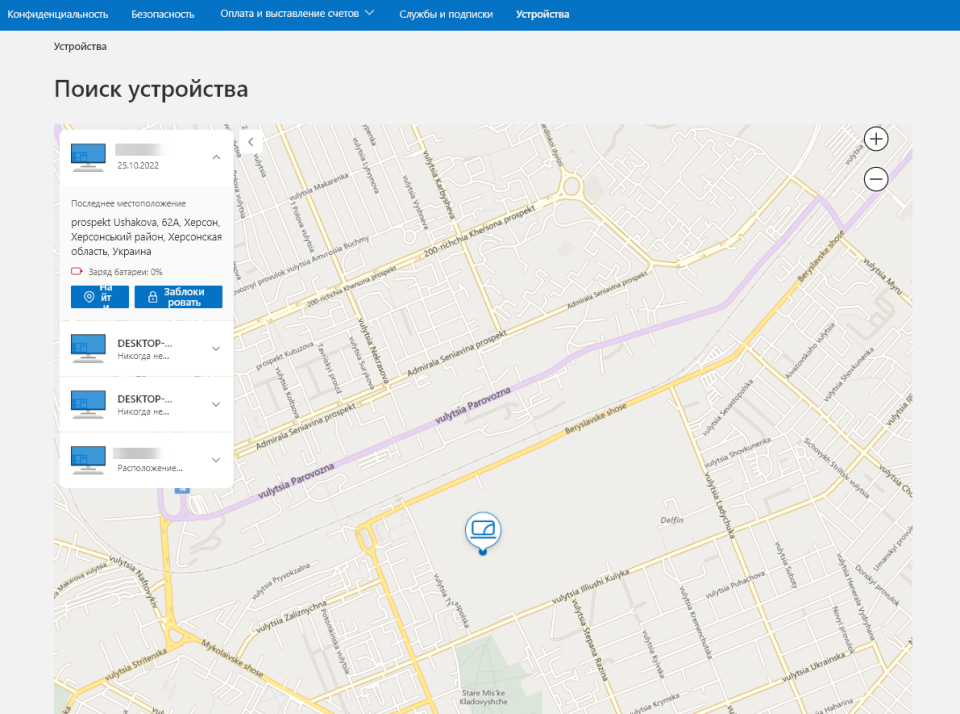 Terror Опубликовано 25 октября, 2022 Опубликовано 25 октября, 2022 Если установлена вин10 или вин11, и в настройках безопасности не отключался пункт поиска устройства, то при подключении компа к инету его можно будет отследить через учетную запись Майкрософта Попробовал так найти свой комп, точностью конечно не блещет, но зато хоть город правильно нашел, а район вообще далекий от моего нахождения Хотя причина может быть в том, что я сижу через мобильный инет Показать