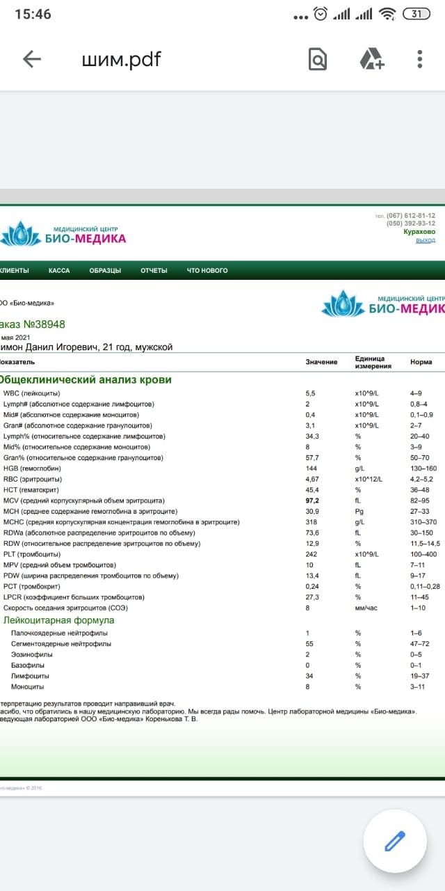 danil-goncharenko Опубликовано 7 октября, 2021 Опубликовано 7 октября, 2021 ребят помогите. анализы не на курсе. что делать с средним москулярным обьемом эритроцита и почему он выходит за референт? врач сказал ничего опасного
