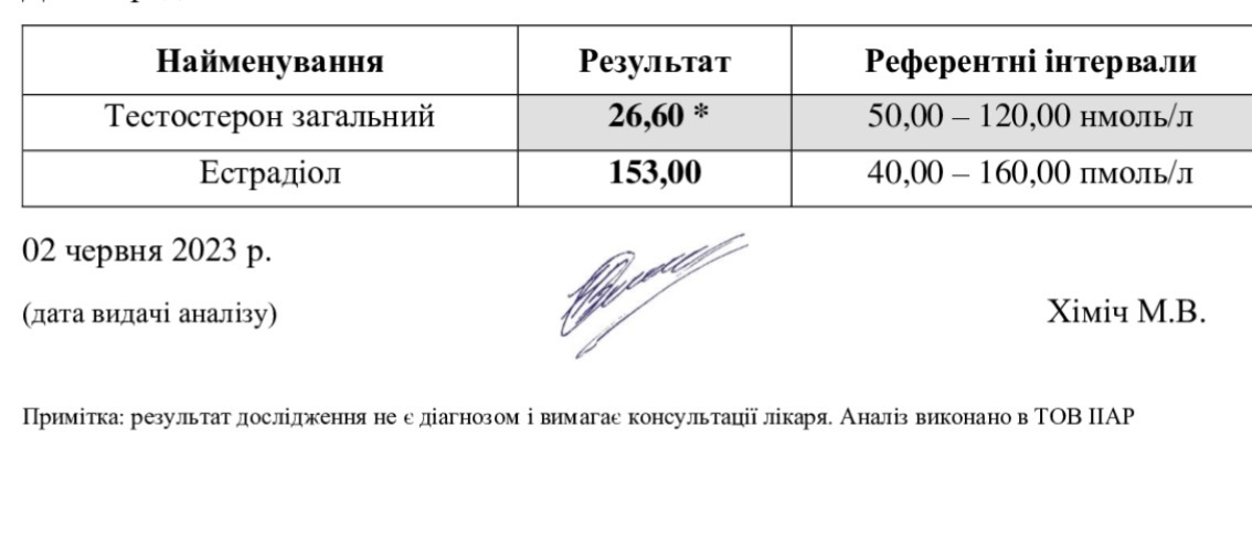 arnold Опубликовано 22 июня, 2023 Опубликовано 22 июня, 2023 Всім привіт Допоможіть будь ласка розшифрувати аналізи. Ендокринолог сказав що все добре, але мене непокоїть вільний тестостерон на ніжній межі. Останій курс десь 8 місяців тому, було пкт і доволі довго відновлювався (важко). Скарг начебто немає. Натуральний тренінг йде задовільно, на минулому курсі був 85, скинув до 70 на пкт. зараз 77. 1.pdf 2.pdf