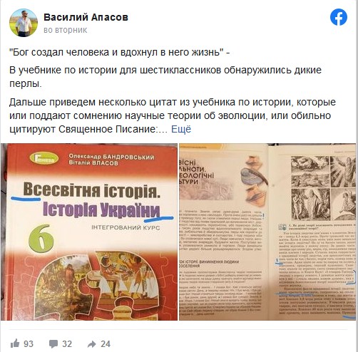 OlegRO Опубликовано 23 сентября, 2021 Опубликовано 23 сентября, 2021 https://www.facebook.com/vasiliyapasoff/pos...469446143093065 В украинских школах больше не учат теории эволюции Дарвина Не верите? Почитайте учебник истории для шестого класса "Бог создал человека и вдохнул в него жизнь" - В учебнике по истории для шестиклассников обнаружились дикие перлы. Дальше приведем несколько цитат из учебника по истории, которые или поддают сомнению научные теории об эволюции, или обильно цитируют Священное Писание: "И сотворил Господь человека из праха земного. И дыхание жизни вдохнул в него - и стал человек живой душой, которая является воплощением божественной теории происхождения человеческой жизни". "Появились существа, которых ученые называют приматами. Около 40 миллиардов лет назад возникли более высокоорганизованные приматы, которых называют обезьянами. Предполагают, что именно от них начался путь формирования человека. Однако сегодня нет точной информации на вопрос, как именно, где и когда возник человек". "Находки дают основания предполагать, что неандертальцы заботились об умерших, хоронили их по определенным ритуалам, что свидетельствует о зарождении веры в загробную жизнь, обожествление сил природы".