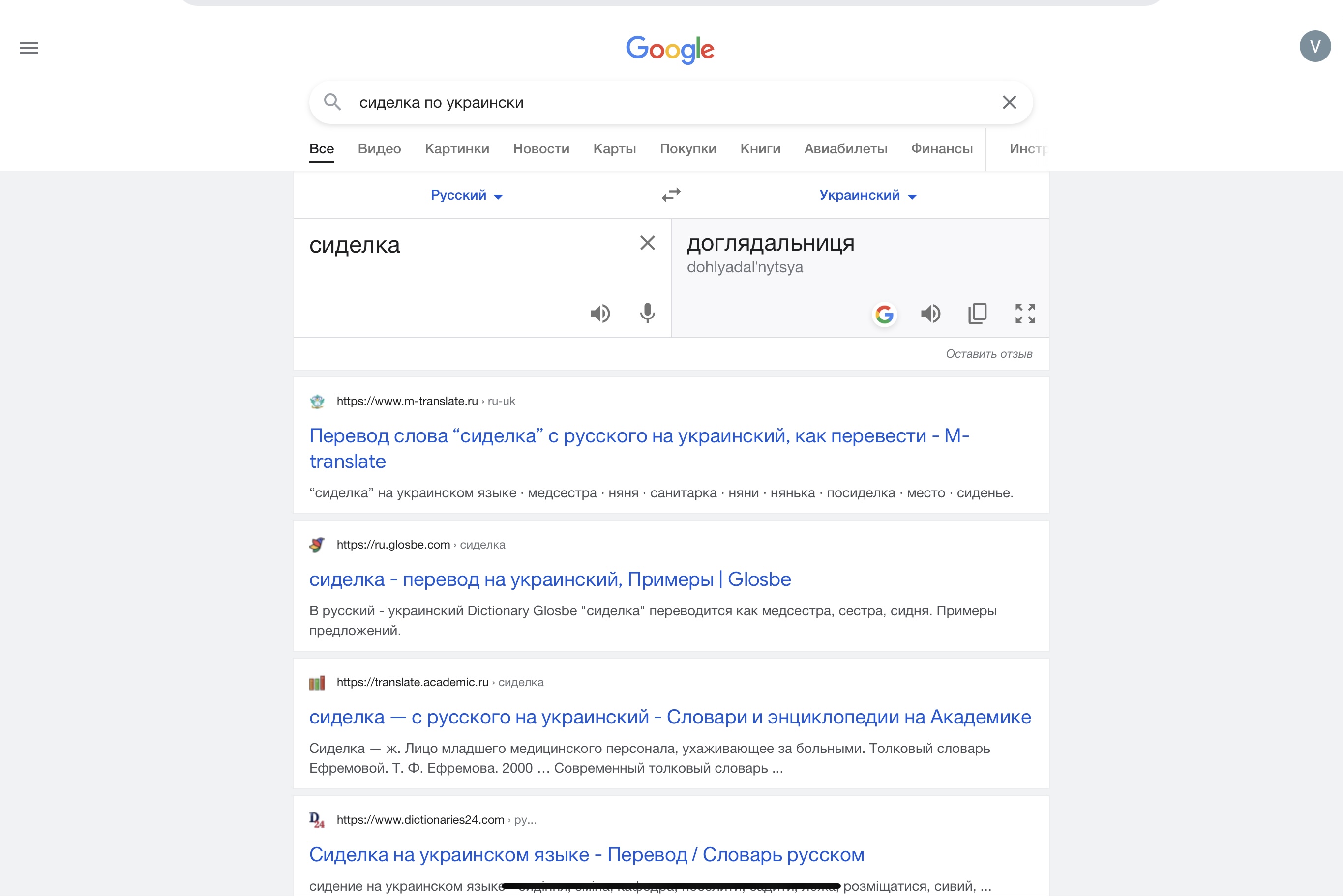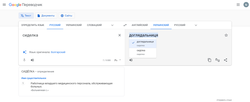 Terror Опубликовано 29 июля, 2022 Опубликовано 29 июля, 2022 Специально полез в Гугл Мне конечно тоже чисто на слух больше нравится "доглядальниця", но в защиту Гугла скажу, что всё же вариант "сиділка" он тоже предлагает, надо было всего лишь нажать слово, которое переводится Показать