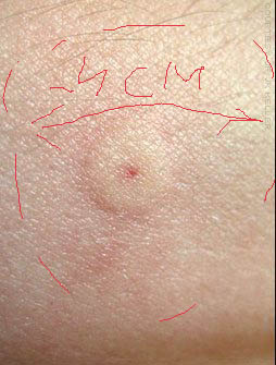 Jus Опубликовано 31 июля, 2012 Опубликовано 31 июля, 2012 Вчера укусила [или ужалила] в предплечье какая-то хренотень непонятная. В том смысле, что не видел, кто именно - мож оса, мож пчела, мож еще кто... к вечеру была только небольшая припухлость с покраснением, к утру думал пройдет. А к утру не прошло, а наоборот припухлость стала больше (наверное от нормального состояния высотой в 3-4 мм) диаметром чуть больше, если пальцы в "окей" сложить и АЦЦКИ чешется, гыдота такая ((( Да, и в центре маленькая точка, место "укуса". Рассматривал внимательно - никакого жала вроде бы нету... Никто не в курсе, че с этой поиботой делать, чтобы прошло побыстрее? Сначала место укуса выглядело примерно так (фото не мое, из инета) сейчас припухлость с покраснением примерно 4-5 см в диаметре