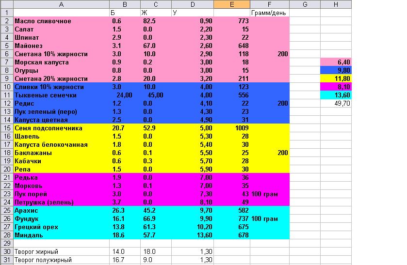 VUBlack Опубликовано 25 октября, 2012 Опубликовано 25 октября, 2012 Я так понял на этой диете лучше не выходить за 50 г углеводов в день на фазе разгрузки, в связи с этим возникли вопросы: 1. Почему в качестве клетчатки выбираете капусту и огурцы, и игнорируете листья салата и шпинат, где клетчатки больше а углей меньше 2. Почему нельзя есть творог, хотя в нем углей в 4 раза меньше чем в той же капусте 3. Советуете есть много орехов, хотя там углеводов тоже не мало Вот накидал примерную таблицу что есть можно из углеводосодержащих продуктов(таблицу брал на сайте, скопил в excel) Еще как думаете, эта диета подошла бы людям которым тяжело набирать массу: в период разгрузки постараться удержать вес, а в период загрузки набрать? 1.xls