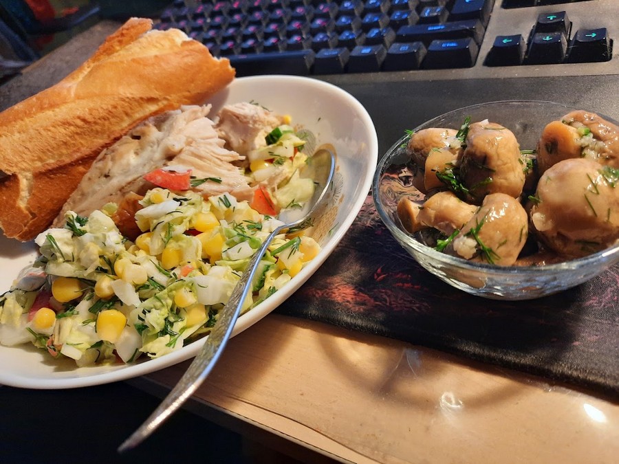 Jus Опубликовано 7 января, 2022 Опубликовано 7 января, 2022 Грибочки маринованные, курочка запеченная, салат из пекинской капусты с кукурузой, огурцом и болгарским перцем и свежайший багет