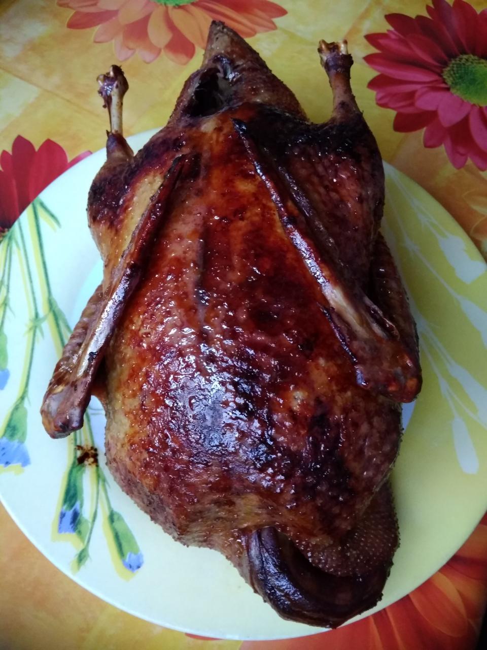 Power_andrey Опубліковано: 9 лютого 2020 Опубліковано: 9 лютого 2020 Тушку утки посолил снаружи и внутри, внутрь яблоки семиренка, "зашил" зубочистками, обмазал слегка горчицей. Выложил на сковородку, сверху накрыл фольгой, в духовку на 2 часа, температура не высокая. Через два часа достал, фольгу снимаем, обмазываю смесью мед, соевый соус, лимон. В духовку, температуру добавляю у меня на печке 240, через время можно опять смесью обмазать. И ждём до нужного цвета.