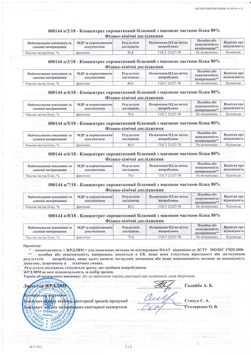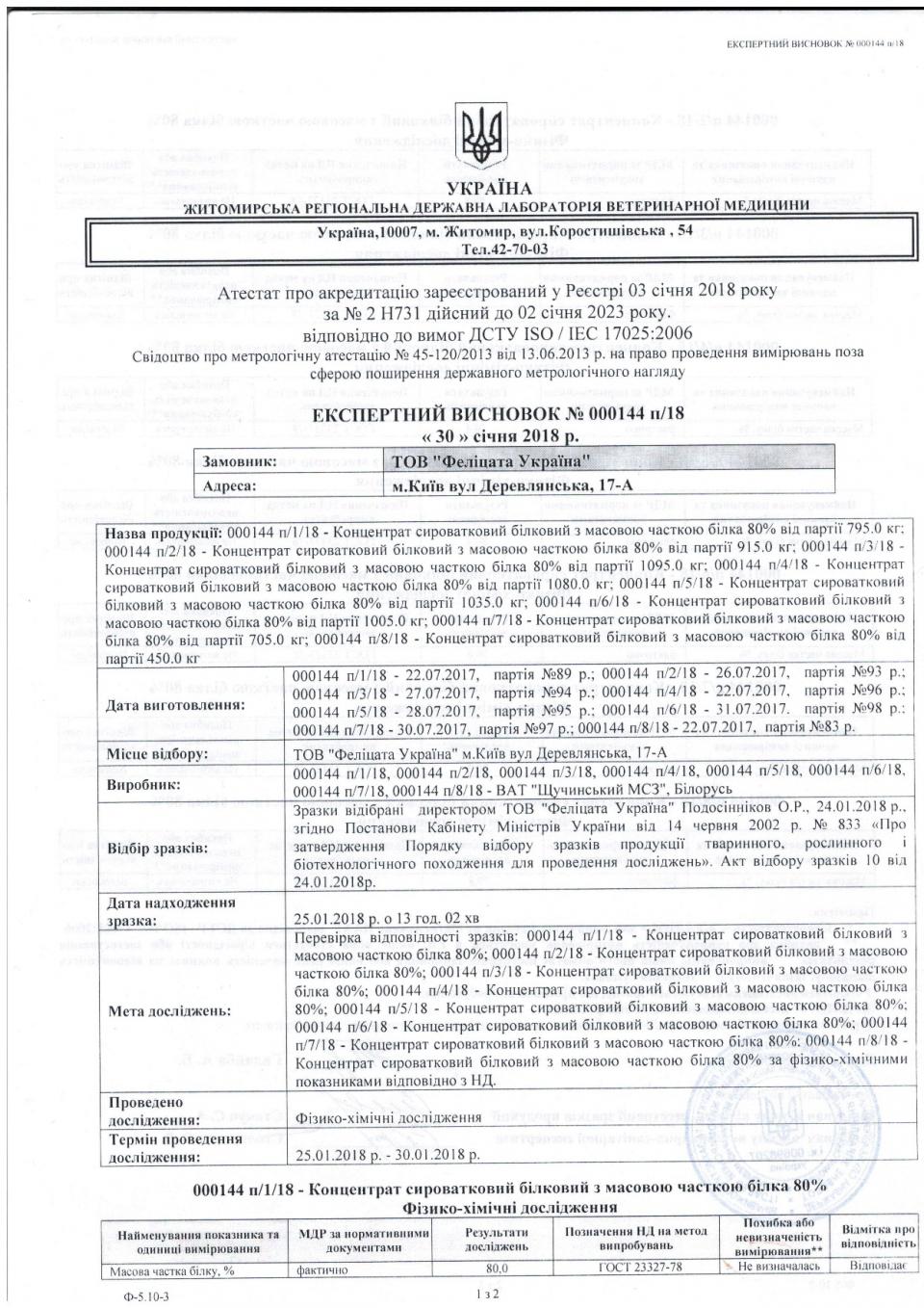 Фелицата Украина Опубликовано 12 февраля, 2018 Опубликовано 12 февраля, 2018 Анализ протеина КСБ-УФ80 Щучинский МСЗ, поставляемый ООО "Фелицата Украина" Выполнен Житомирской РДЛВМ, аттестат аккердитации №2H73. ( см. вложение) Было протестировано 8 образцов: образец 1 - 80,0% образец 2 - 80,8% образец 3 - 80,6% образец 4 - 79,4% образец 5 - 80,4% образец 6 - 79,6% образец 7 - 80,2% образец 8 - 79,8% Весь протеин отпускается по серийно. Мы можем отследить реализацию протеина по контрагенту, количеству, серии, дате выпуска в течение всего срока годности 413 суток. Серии, которые поставляются в Украину, отличаются от серий, которые реализуются в РБ или других странах. Сейчас поставляется протеин только в мешках по 15кг.