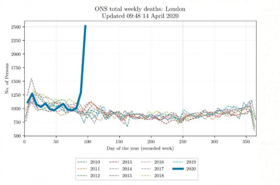 Лондон. Щотижнева кількість смертей. Цього року і у порівнянні з минулими.