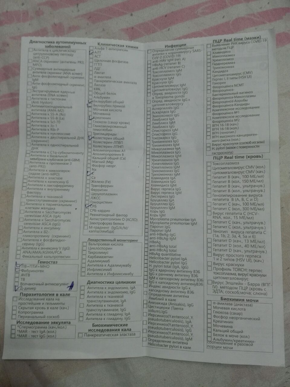 По биохимии я сказал сдать всю,лишним не будет.По гемостазу вообще не секу,почитал вроде нужные назначила.Но может кто в курсе вопроса и надо еще чего добавить.Так как к врачу обратиться другому возможности там нет.То хочу потом со всеми результатами тут дистанционно врача найти или лично или по скайпу.