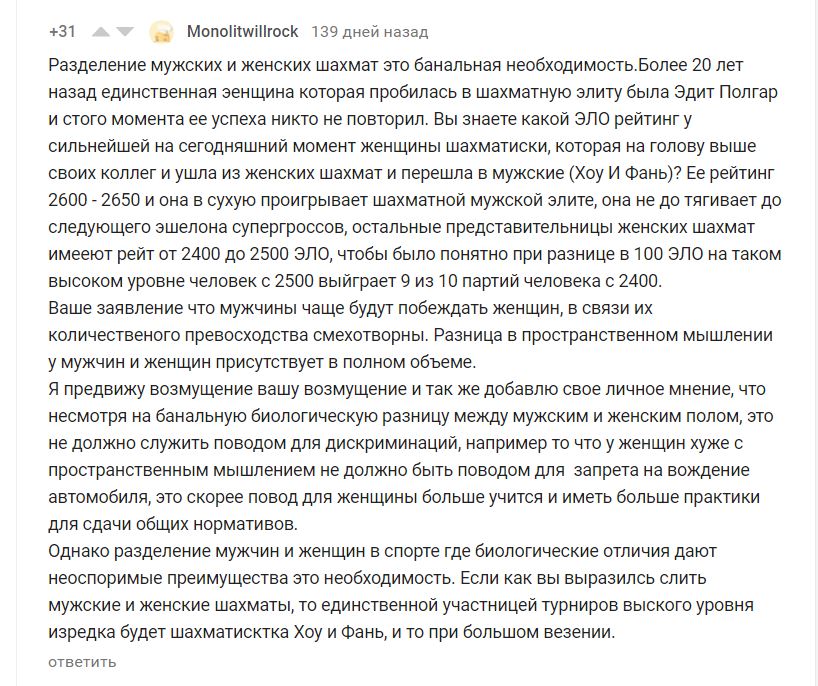 Outlawif Опубликовано 13 июня, 2019 Опубликовано 13 июня, 2019 Есть научно доказанная связь между пространственным мышлением и умением играть в шахматы? Чтобы быть объективным, я вообще-то тоже считаю, что в спорте должны быть отдельные женские и мужские лиги, причем в любом. И в шахматах тоже. Но у меня на этот счет другие гипотезы, которые я не стану высказывать, они очень слабо обоснованы. Однако, такие безапелляционные заявления с какими-то псевдоочевидными утверждениями меня бесят. Целый ряд утверждений, которые сами по себе требуют доказательства, и на основе их вывод. Может верный, может нет, но однозначно не обоснованный этим детским лепетом.