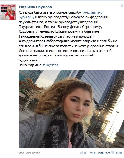 wolf Опубликовано 29 февраля, 2016 Автор Опубликовано 29 февраля, 2016 В Федерации пауэрлифтинга России опровергли положительную пробу Наумовой Отец спортсменки также заявил, что информация о положительной допинг-пробе и дисквалификации четырехкратной чемпионки мира не соответствует действительности Москва. 29 февраля. INTERFAX.RU - Информация о дисквалификации Марьяны Наумовой, в крови которой якобы найдены запрещенные препараты, не соответствует действительности, заявил "Интерфаксу" вице-президент Федерации пауэрлифтинга России (ФПР) Денис Басов. В понедельник в "Интерфакс" поступило сообщение, якобы, присланное пресс-службой ФПР об отстранении от соревнований 16-летней Марьяны Наумовой, являющейся четырехкратной чемпионкой мира по пауэрлифтингу. В заявлении утверждалось, что в крови спортсменки в пробе, взятой в Кельне, найдены запрещенные препараты Stanozolol, а также "Ипаморелин". К письму было приложено решение президиума ФПР за подписью ее президента Сергея Косарева, в котором также утверждалось, что отец спортсменки Александр Наумов оштрафован на 30 тыс. рублей. Как позднее пояснил Басов "Интерфаксу", федерация не распространяла подобного сообщения. "Использован бланк генерального секретаря, которая не подтверждает данное письмо. Во-вторых, подпись Сергея Косарева (президента федерации - ИФ) кто-то подделал. В третьих - такие решения приходят к нам от Международной федерации пауэрлифтинга, у нас его нет. Указанный штраф тоже липовый. Так что мое мнение - это подделанный документ", - сказал Басов. Он отметил, что спортсменка недавно была на соревнованиях в Белоруссии, прошла допинг-контроль и ее пробы дали отрицательный результат. Отец спортсменки также подтвердил "Интерфаксу", что его дочь прошла допинг-контроль в Минске. "Мы сдали допинг-контроль в Минске, а проверяли образцы в Дрездене. У нас ничего не нашли и сейчас мы допущены на все международные соревнования", - cказал он. "У нас очень много недоброжелателей в виду ее общественной работы, и у меня просто есть ощущение, что нам просто хотят сорвать выезд на международные соревнования", - добавил Наумов.