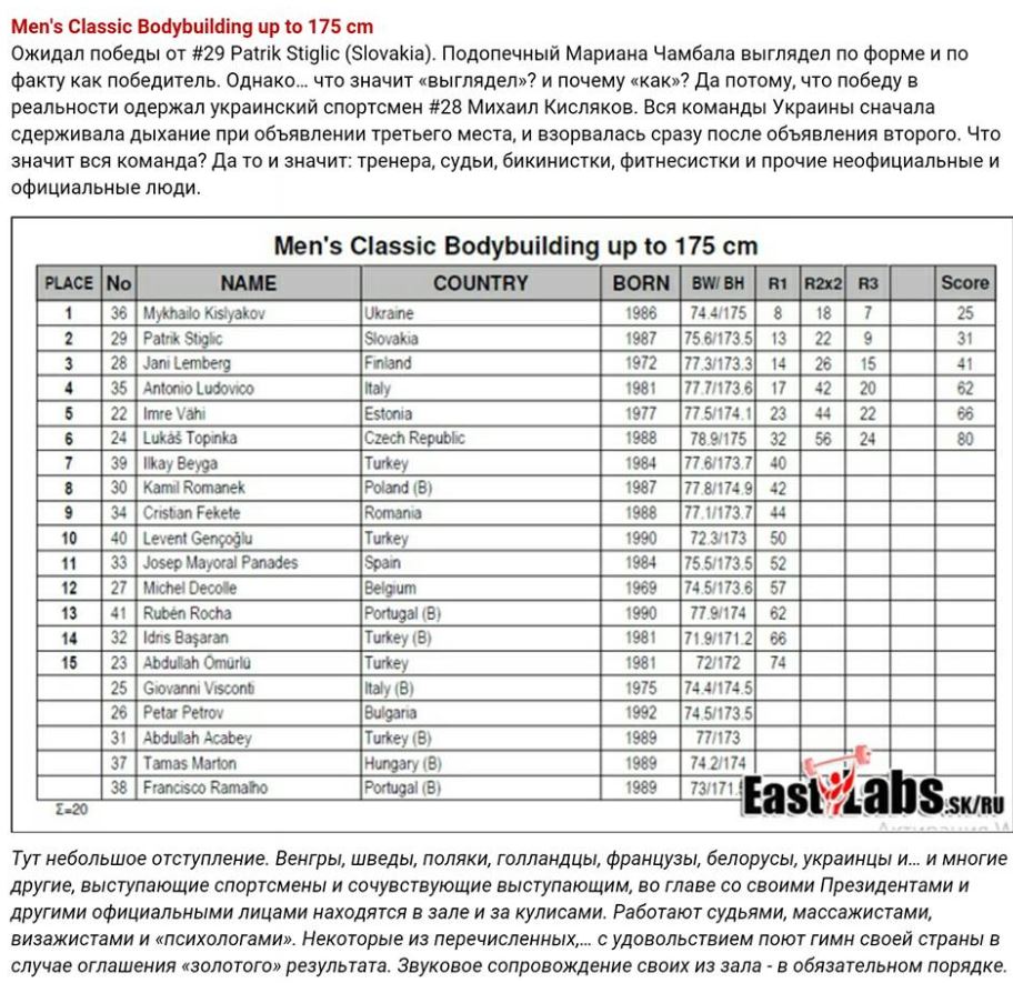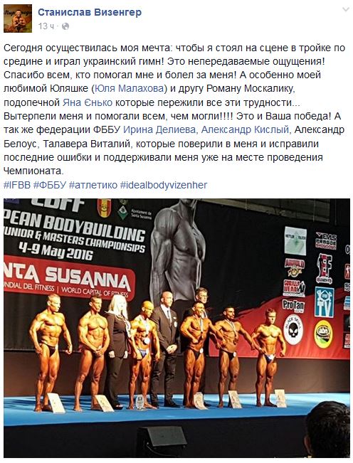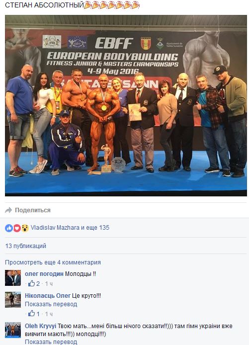 wolf Опубликовано 28 апреля, 2016 Автор Опубликовано 28 апреля, 2016 2016 European Championships Состав сборной Украины на объединенный Чемпионат Европы IFBB, который будет проходить с 4 по 9 мая в Санта Сусанне, Испания. 1. Nazar Kharkhun – Men’s fitness open (А) 2. Yevhen Partaloha – Men Physique over 178 cm (А) 3. Serghei Semeniuc – Men Physique over 178 cm (А) 4. Stanislav Vizenher – Men Classic Bodybuilding up to 168 cm (А) 5. Mykhailo Kislyakov – Men Classic Bodybuilding up to 175 cm(А) 6. Artem Shulzhenko – Men Bodybuilding up to 80 kg (А) 7. Stepan Stepanenko – Men Bodybuilding up to 95 kg (А) + Junior Men Bodybuilding over 75 kg (А) 8. Adam Kozyra – Men Bodybuilding over 100 kg (А) 9. Andriy Sharapov – Master Men Bodybuilding 40-49 yrs up to 80 kg (А) 10. Valerii Koptenko – Master Men Bodybuilding 50-59 yrs up to 80 kg (А) 11. Elena Chernousenko – Master Women Body-Fitness age 35-44 yrs (А) 12. Olha Martynova – Women Body-Fitness up to 163 cm (А) + Master Women Body-Fitness age 35-44 yrs (А) 13. Yuliya Horyachun – Women Body-Fitness up to 163 cm (А) 14. Liudmyla Matvieieva – Women Body-Fitness up to 163 cm (В) 15. Mariia Akizhanova – Women’s physique up to 163cm (А) 16. Maryna Zaporozhets – Women’s physique up to 163cm (В) 17. Oleksandra Dubinina – Women’s physique over 163cm (А) 18. Yana Yenko – Junior Women Bikini-Fitness up to 160cm (А) 19. Yevheniia Pushka – Junior Women Bikini-Fitness up to 160cm (А) 20. Nataliia Partaloha – Women Bikini-Fitness up to 160cm (А)+ Master Women Bikini-Fitness age >35 yrs (А) 21. Olena Ohanova – Women Bikini-Fitness up to 160cm (В) 22. Anastasiya Kabanova – Women Bikini-Fitness up to 163cm (А) 23. Viktoriya Kozychko – Women Bikini-Fitness up to 163cm (В) 24. Oleksandra Kostyleva – Women Bikini-Fitness up to 163cm (В) 25. Natalia Rahushenko – Women Bikini-Fitness up to 166cm (А) 26. Kristina Tokareva – Women Bikini-Fitness up to 166cm (В) 27. Oksana Brygidyr – Women Bikini-Fitness up to 169cm (А) 28. Alina Yaman – Women Bikini-Fitness up to 169cm (В) 29. Liudmyla Nasonova – Women Bikini-Fitness up to 172cm (А) 30. Mariia Kvasnikova – Women Bikini-Fitness up to 172cm (В) 31. Yevheniia Suprun – Women Bikini-Fitness over 172cm (А)