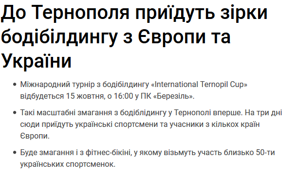 Garon Опубликовано 5 октября, 2017 Опубликовано 5 октября, 2017 - У п'ятницю, 13 жовтня, спортсмени реєструватимуться. А в суботу, 14 жовтня, зірки бодібілдингу - Мілан Шадек та Денніс Вольф проведуть семінари для учасників у готелі "Авалон", - каже віце-президент Тернопільської обласної федерації бодібілдингу та фітнесу Віталій Смовж. - На семінари можуть прийти усі охочі, але вхід буде платним. А уже в неділю, 15 жовтня, відбудеться чемпіонат. До Тернополя приїде 17 спортсменів з Європи: Чехії, Польщі, Іспанії, Голландії. З України буде три спортсмени: киянин, абсолютний чемпіон Європи Володимир Бірук, чемпіон Європи у категорії +100 кг Адам Козира і абсолютний чемпіон Європи серед юніорів Степан Степаненко з Запоріжжя. - Також буде змагання з фітнес-бікіні, у якому візьмуть участь приблизно п'ятдесят українських спортсменок, - каже Віталій Смовж. - Також будуть і учасниці з Тернополя. Призовий фонд турніру складе 30 тисяч гривень. Крім того, абсолютна чемпіонка отримає 10 тисяч гривень від спонсора турніру. А призовий фонд «International Ternopil Cup» - 10 000 доларів. Грошові винагороди отримають перші десять спортсменів підсумкового протоколу. Чемпіон отримає 3 000, за дурге місце - 2 000 а третє - 1 500 доларів. Ще сім спортсменів отримають по кілька сот доларів, залежно від місця. Квитки на «International Ternopil Cup» можна придбати в ЦУМі, на сайті Concert.ua і спортклубі «Колізей». Їхня вартість – 350 гривень.