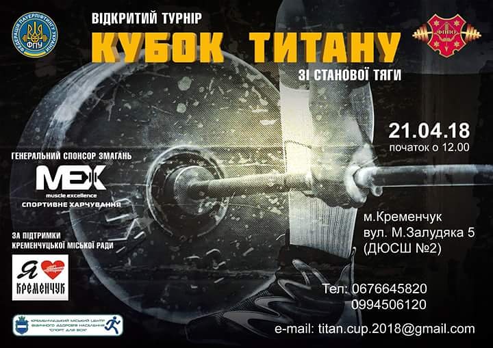 MaxSan Опубликовано 22 марта, 2018 Опубликовано 22 марта, 2018 Відкритий турнір Кубок Титану з класичної станової тяги. Де: Полтавська область, м.Кременчук, ДЮСШ №2, вул. М.Залудяка, 5 Коли: 21.04.2018 💪 Запрошуємо всіх бажаючих до участі! Переможці та призери змагань нагороджуються грамотами, медалями та цінними подарунками від генерального спонсору змагань MEX Muscle Excellence. Початок змагань о 12:00. Мандатна комісія з 9:30 до 10:00. Зважування з 10:00 до 11:30. Для участі у змаганнях необхідно заповнити та відправити попередню заявку на електронну пошту titan.cup.2018@gmail.com. Попередні заявки необхідно подати до 19.04.2018. Вимоги до екіпірування: трико, футболка, взуття (кросівки чи спеціальне взуття для важкої атлетики та пауерліфтингу), пояс, бинти на зап’ястя (за бажанням). Документи, які необхідно надати суддівській колегії в день змагань: - Іменна заявка з допуском лікаря; - Документ, що підтверджує особу учасника (паспорт, свідоцтво про народження). Високий рівень організації та якісне суддівство гарантуємо!