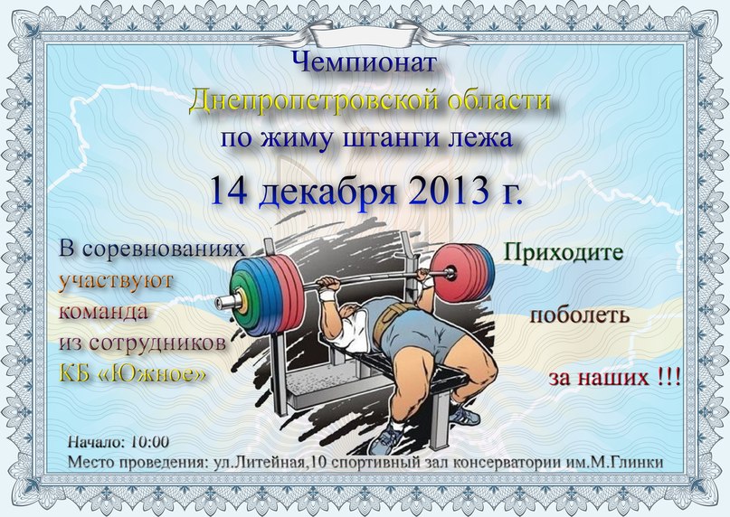 lifter Опубликовано 2 декабря, 2013 Опубликовано 2 декабря, 2013 Пока едем в поезде, сделаю анонс) 14 декабря состоится Кубок Днепропетровской области по жиму лежа (без экипировки). Приглашаем всех желающих посетить данный старт. Мини афиша, сдеданная для сотрудников КБ Южное и завода Южмаш. Только от "ракетостроителей" будет участвовать 12 человек. )