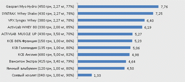 KUBA Опубликовано 21 октября, 2012 Опубликовано 21 октября, 2012 Стоимость порции протеина (в гривнах), содержащей 30 грамм чистого белка. Цены форума. Личные ремарки: 1) ON Gold Standard - не включил по причине не оправдано высокой цены (порция 9 гривен). 2) Gaspari Myo Hydro - как по мне самый качественный импорт за достойную цену. 3) SYNTRAX Whey Shake - по заверениям SYNTRAX лучший КСБ на рынке США. 4) VPX Syngex Whey - качественный и недорогой брендовый. Ну и остальные хиты сезона. Все наочно. Выводы пусть каждый делает сам. Я вот в целях максимальной экономии со следующей закупкой попробую смешать Ванситон Экстра и 1 кг соевого изолята. Дешево и сердито.