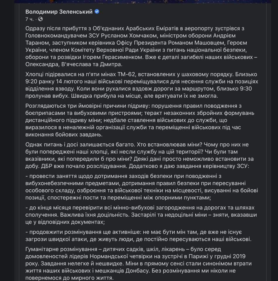 Однак питань і досі залишається багато. Хто встановлював міни? Чому про них не були попереджені наші хлопці, які несли службу на цій території? Чи були там вказівники, які попередили б про міни? Деякі дані просто неможливо встановити за добу. ДБР вже почало розслідування. Додатково я даю завдання керівництву ЗСУ: