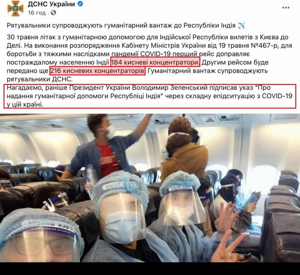 "Во исполнение распоряжения Кабинета Министров Украины от 19 мая №467-р, для борьбы с тяжкими последствиями пандемии COVID-19, первый рейс доставляет пострадавшему населению Индии 184 кислородные концентраторы. Вторым рейсом будет передано еще 216 кислородных концентраторов", - говорится в сообщении. Гуманитарный груз сопровождают украинские спасатели.