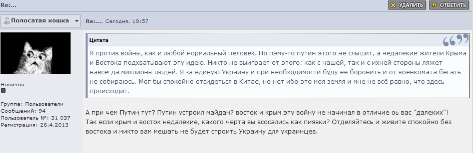 Всё таки начала совесть мучать, что поставил минус Полосатой Кошке, решил пообщаться в ЛС. Вот что получил в ответ от неё: