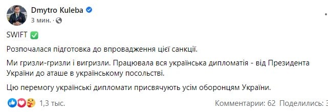 ❗️Принято решение отключать РФ от SWIFT, сообщил Дмитрий Кулеба