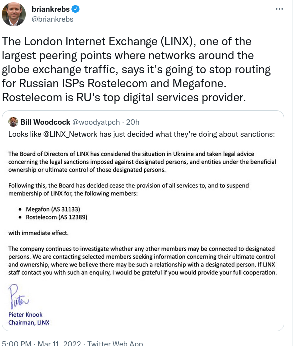Крупная точка обмена трафиком (LINX) отключает Мегафон и Ростелеком, интернет у них не пропадет но тепер побежит через Азию, что скажется накачестве.