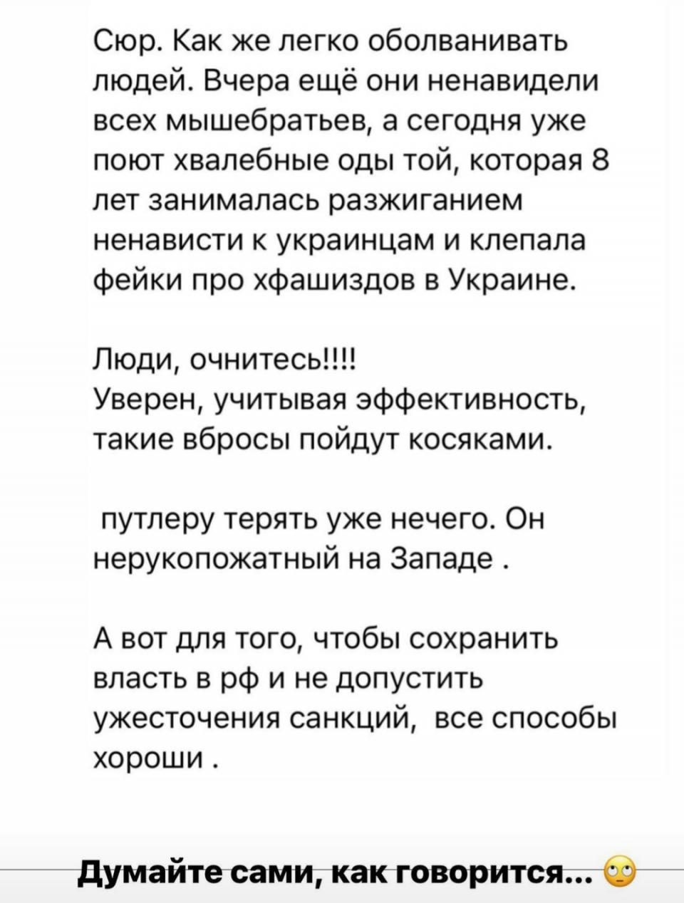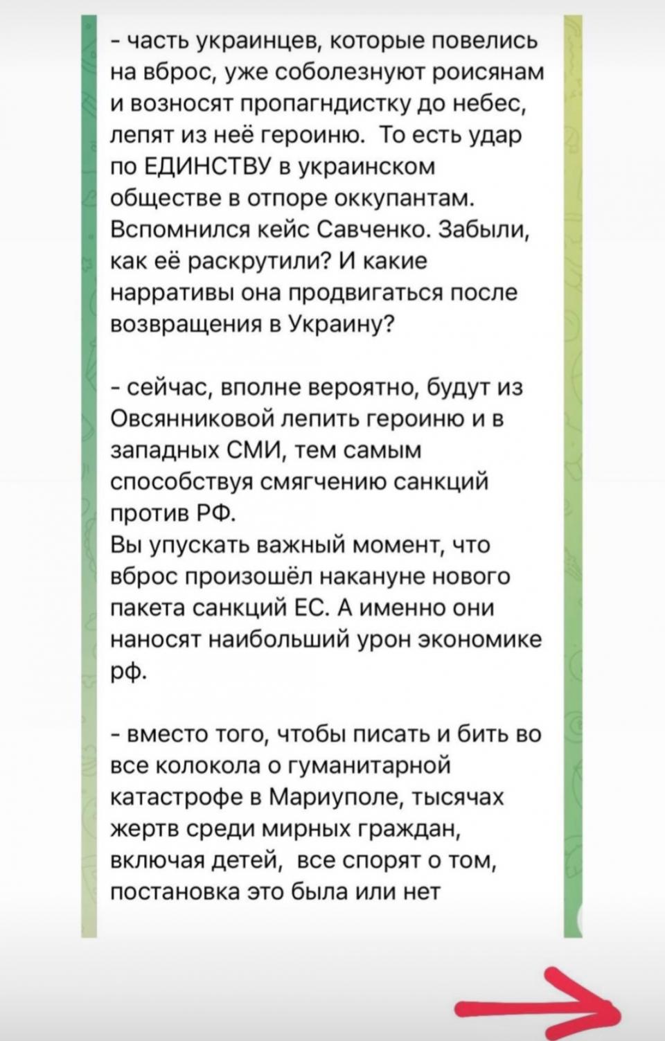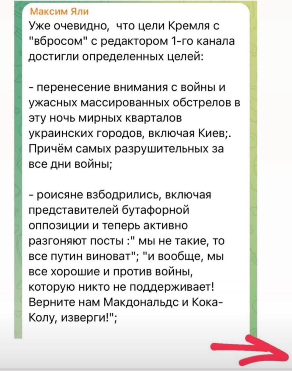 Ты на месте кремля создала бы подобный сценарий с подобной целью? Серьезно? То есть, не какого-нибудь голодного из-за санкций ребенка в московском пустом магазине с украинским флагом, или что-то в этом духе, а просто взять и чтобы рупор пропаганды вдруг переобулся в прямом эфире и рубанул правду? Такое только у Джека Воробья срабатывало, но там солдаты были карикатурно тупые.