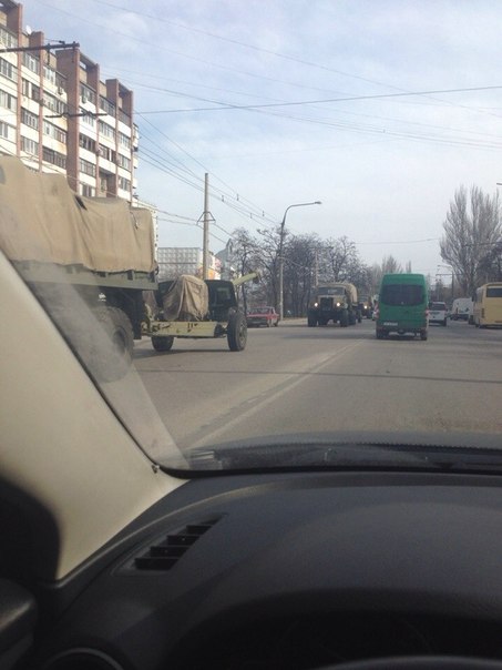 Запорожье сегодня, около 4 часов. 2 боевые машины МТЛБ, 7 грузовиков с гаубицами, 3 грузовика с кунгом и двумя полевыми кухнями ехали своим ходом. Предположительно в сторону Днепропетровска. Вся техника принадлежит войскам Украины. Откуда или куда направляются колона официально неизвестно - военные не комментируют ситуацию, но намекают, что это учения и они были запланированы давно.