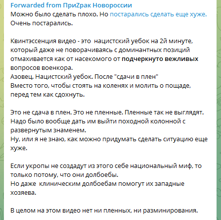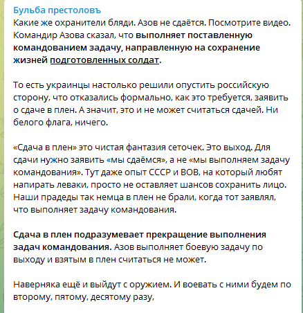 У меня складывается впечатление, что операция по пленению азовцев это большая демотивирующая бомба. Хотя в официальных сми рф это преподносится как победа, среди самих орков настроения очень грустные, т.к. условия для плена созданы максимально комфортные. Азовцев лечат и кормят лучше чем собственных вояк.
