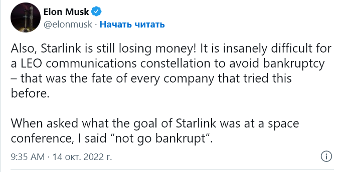 Маск также добавил, что Starlink все еще теряет деньги. Он добавил, что безумно тяжело для спутников связи на низкой орбите избежать банкротства. По словам Маска, такой была судьба каждой компании, которая пыталась это сделать раньше.