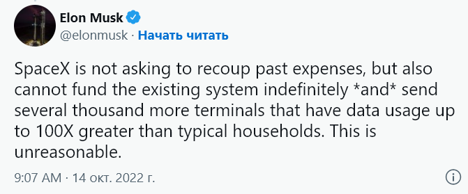 Прямая речь Маска: "SpaceX не просит возместить прошлые расходы, но также не может финансировать существующую систему бесконечно *и* отправить еще несколько тысяч терминалов, которые используют данные до 100 раз больше, чем обычные домохозяйства. Это неразумно".