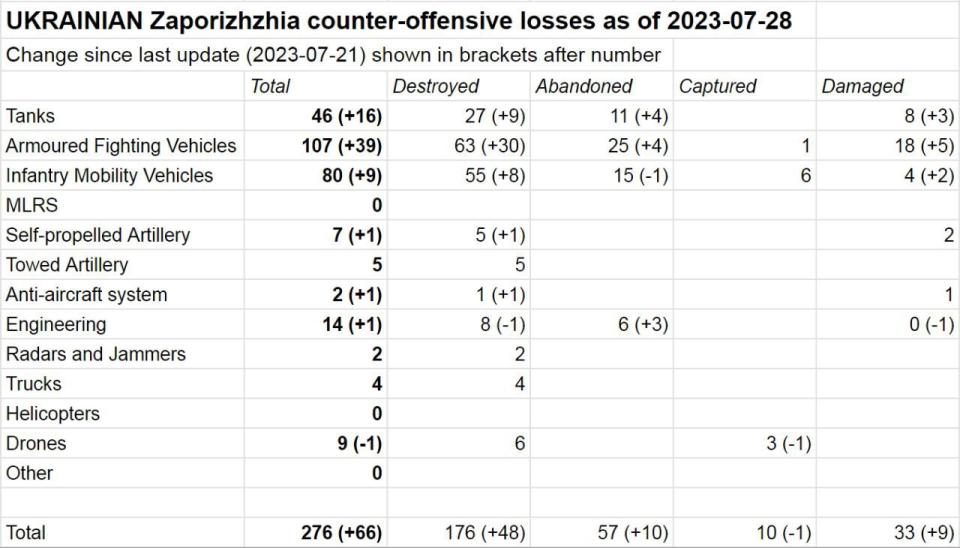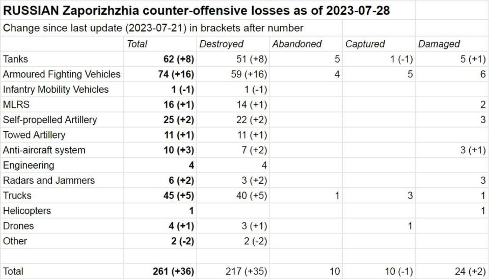 На 28 июля потери составляют: 276 к 261 - в пользу ВС РФ. Фактически по-прежнему имеем соотношение 1 к 1, с небольшим преимуществом у русских.
