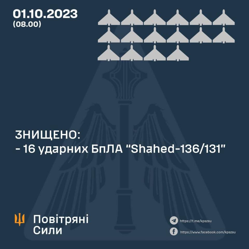 В ночь на 1 октября российские оккупанты запустили 30 дронов-камикадзе Shahed-136 по Украине, из которых сбито было 16. Возможно, их не зачислят в общее количество за сентябрь, но я зачислю, поскольку пуск осуществлялся в 20:30 30 сентября.