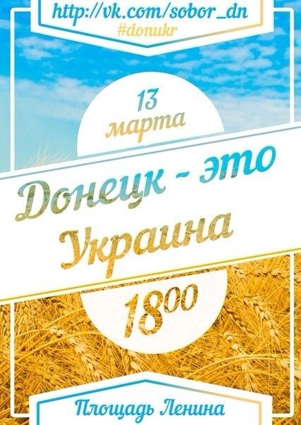 "Сегодня, 13.03.2014 в 18:00 на центральной площади Донецка будет митинг на Единую Украину! Нужно показать реальную позицию большинства жителей Донецка, а не засланных гопников с России. Будет внимательны и осторожны, приходите не одни - готовятся серьезные провокации. Милиция пообещала организовать защиту, однако лучше рассчитывать только на себя. Предлагаем вам иметь при себе дождевики или зонтики, на случай непредвиденных осадков. Также разумно будет запастись медицинскими масками, на случай извержения вулкана)"
