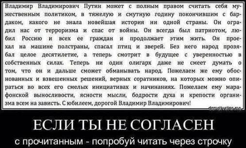Простая русская душа,тупая рожа алкаша. Портянки,путин и Ед.Ро.,в сенях помойное ведро. Гулянка в будни до утра и кабачковая икра. На полке ленина портрет, по пьянке дворнику миньет. Видон на свалку из окна и вечно битая жена. Дочь-блядь,сыночек-наркоман, муж лёг на засцаный диван. Подезды с запахом мочи, без штукатурки кирпичи. На свадьбах-драки, мордобой,секс с друга пьяного женой. Палёнка,гречка маргарин,закуска русских образин. Бухнул-под задницу пинка. О ДААААА!!! РОССИЯ велика.
