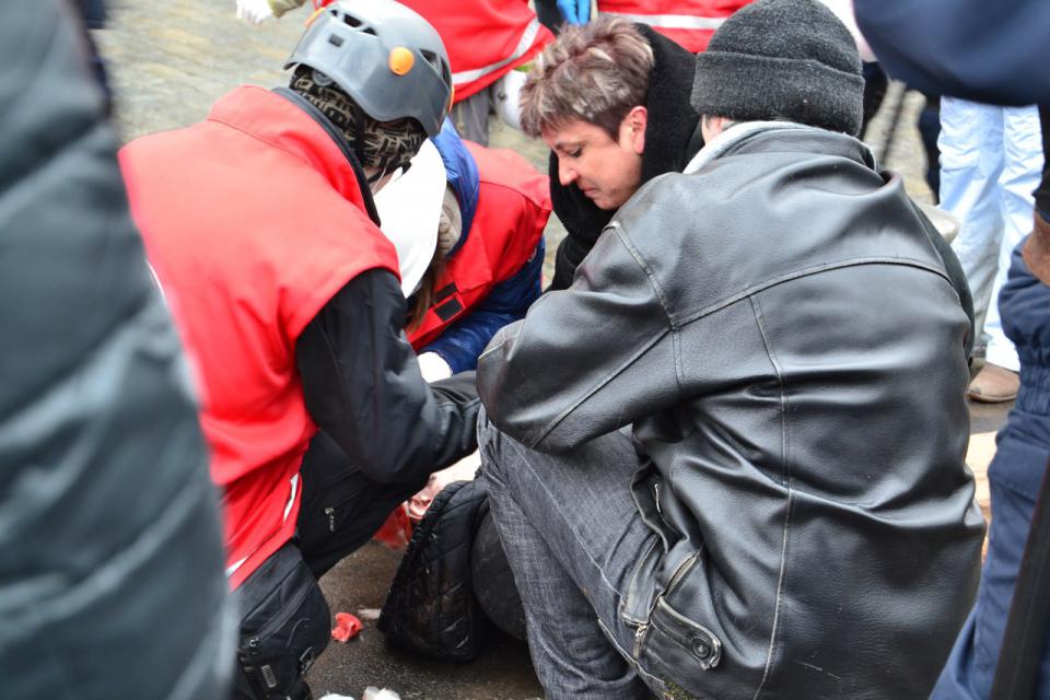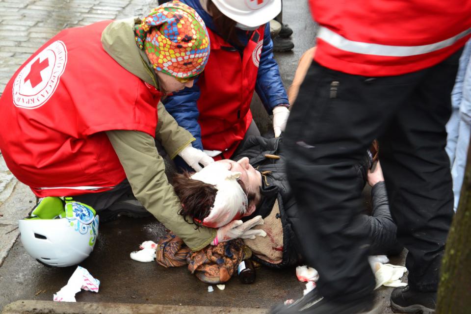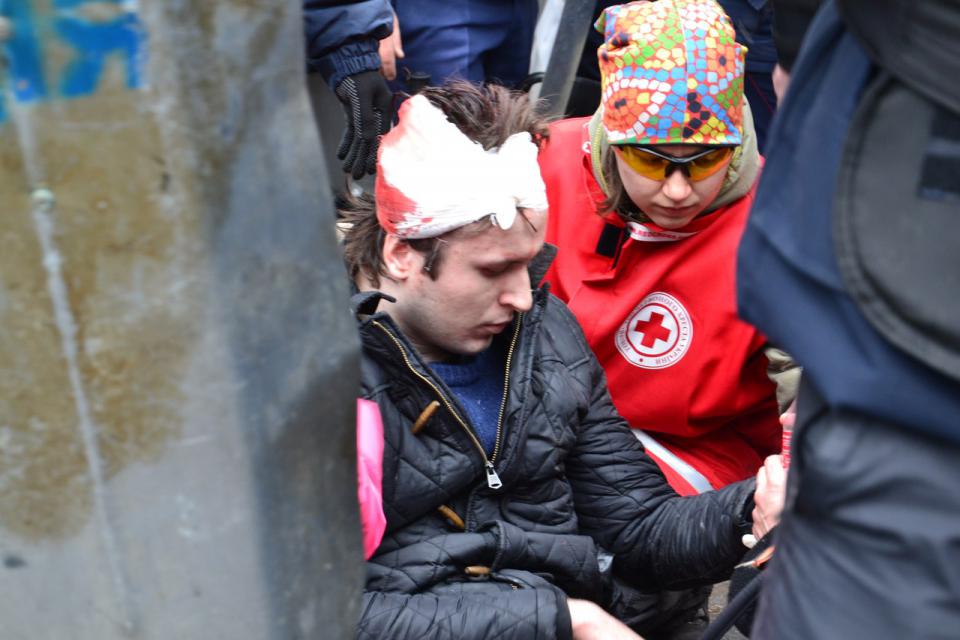 Возле метро отступающую колону Майдановцев ждала группа ребят с гвардейскими лентами и битами. Части протестующих удалось прорваться в метро, часть скрылась в дворце пионеров, то что произошло с теми кому укрытия найти не удалось видно на фотографиях.