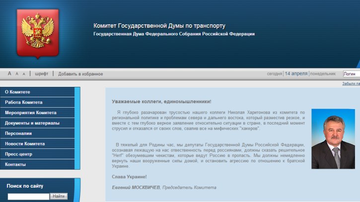 Українські хакери знову зламали сайт Держдуми Росії. Цього разу - сторінку Комітету Держдуми з транспорту і від імені голови комітету розмістили чергове антиросійське звернення.