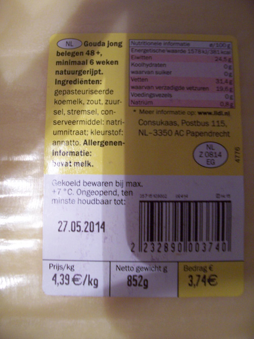 К вопросу о ценах в Европе. Этикетка голландского сыра, вкусного и качественного (не какой-то там "сырный продукт"). Это у нас почему-то такой парадокс, что сыр (а то и творог) почему-то стоит дороже мяса и куриного филе.