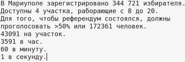 В Донецке тоже явка была довольно большая, почти как на выборах. Но многие, как я понимаю, голосовали "против", а по факту сделали картинку с количеством людей.