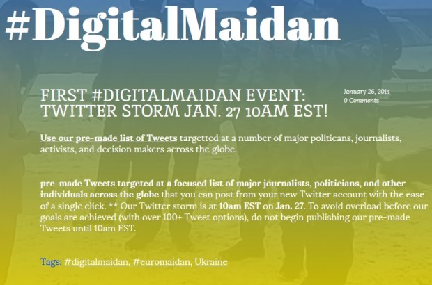 Сьогодні о 17:00 за Києвом активісти розпочинають твітер-шторм на підтримку #ЄвроМайдану. Twitter storm – це публікація у Twitter великої кількості повідомлень з однаковим хештегом (hashtag). Як повідомляють організатори твіттер-шторму, на 17.00 вони підготують близько 100 твітів, які будуть розміщені на сторінці digitalmaidan.com/pre-made-tweets. Tвіти будуть націлені на телеканали, газети, чиновників, знаменитостей.